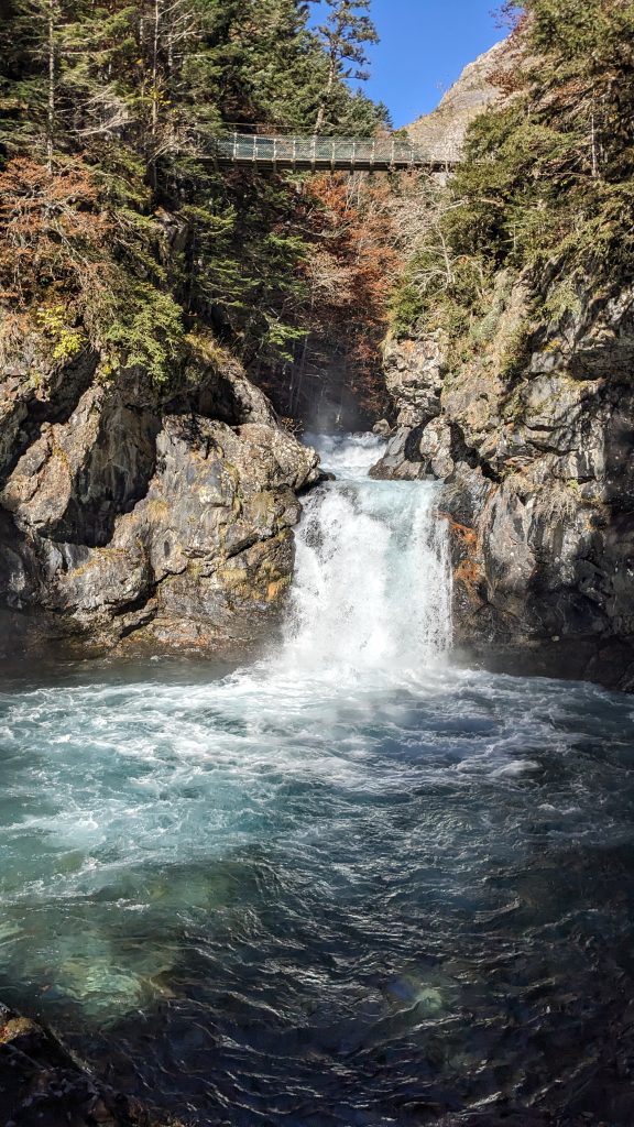 Aquí lo humano apenas se impone: es solo un paso funcional, siempre a merced de la cascada , muchas veces este puente requiere reparación por la fuerza del agua. Un lugar espectacular, pero recordándonos siempre que la naturaleza tiene la última palabra. Ardonés.