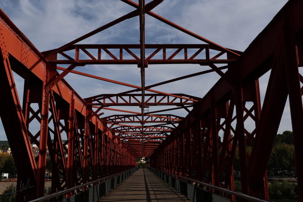 Puente colgante de diseño industrial, funcional y sobrio, pero con cierta estética. El acero y el hormigón se alían, símbolo de una época