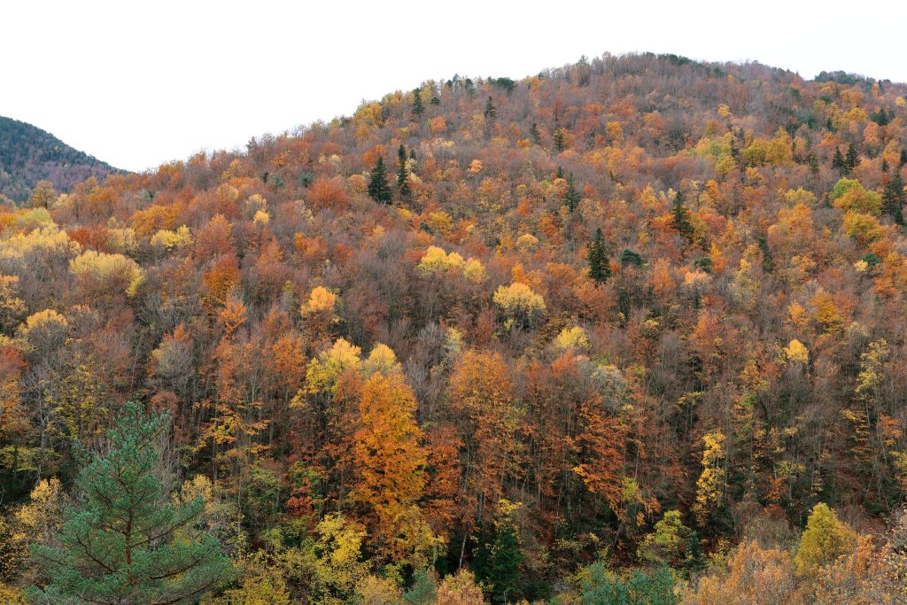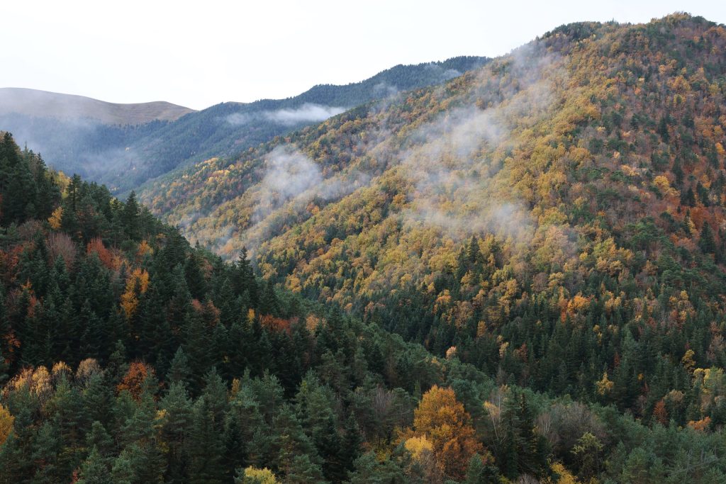 Un bosque mixto inmenso, de coníferas y caducifolios, montañoso y exigente, poco amable para rutas senderistas, es sin embargo un deleite visual.