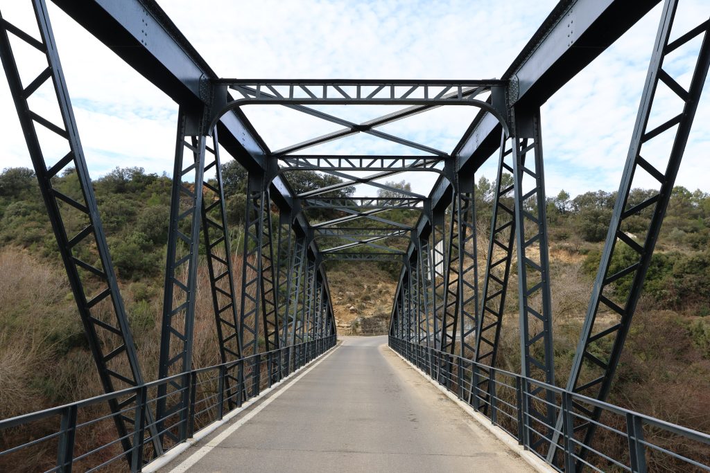 Puente recién restaurado, de diseño industrial y tipología próxima al arco tensado, plenamente integrado en el entorno.